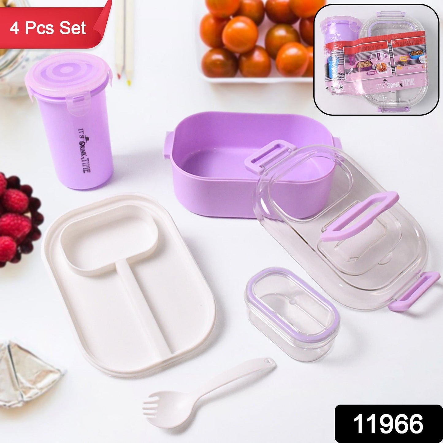 Plastic Lunch Box With Small Box, Bottle & Sponn for Kids Lunch Box (4 Pc Set)