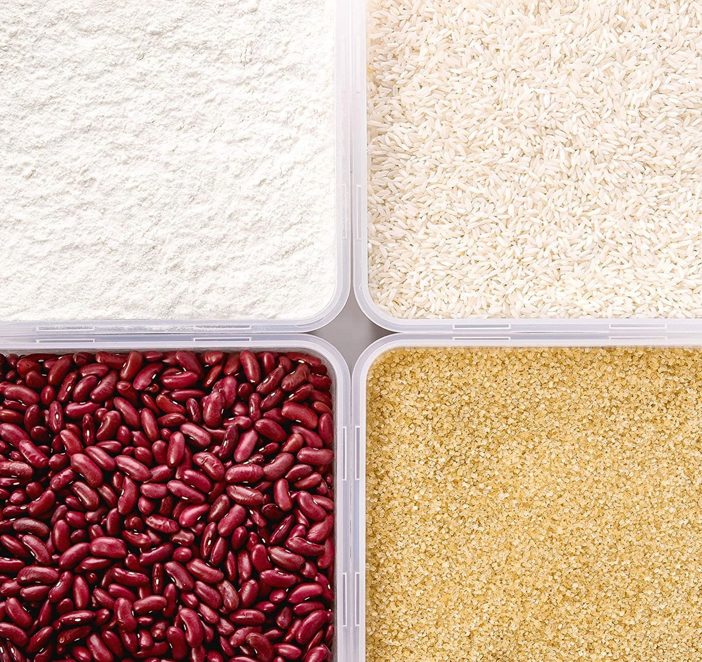 The Lids of this storage containers are airtight, which prevents moisture from entering into the container and significantly reduces the chances of developing bugs \ pests \ molds \ Funguses. Airtight storage system will always keep your food dry and fresh. Easy to clean and dishwasher safe.