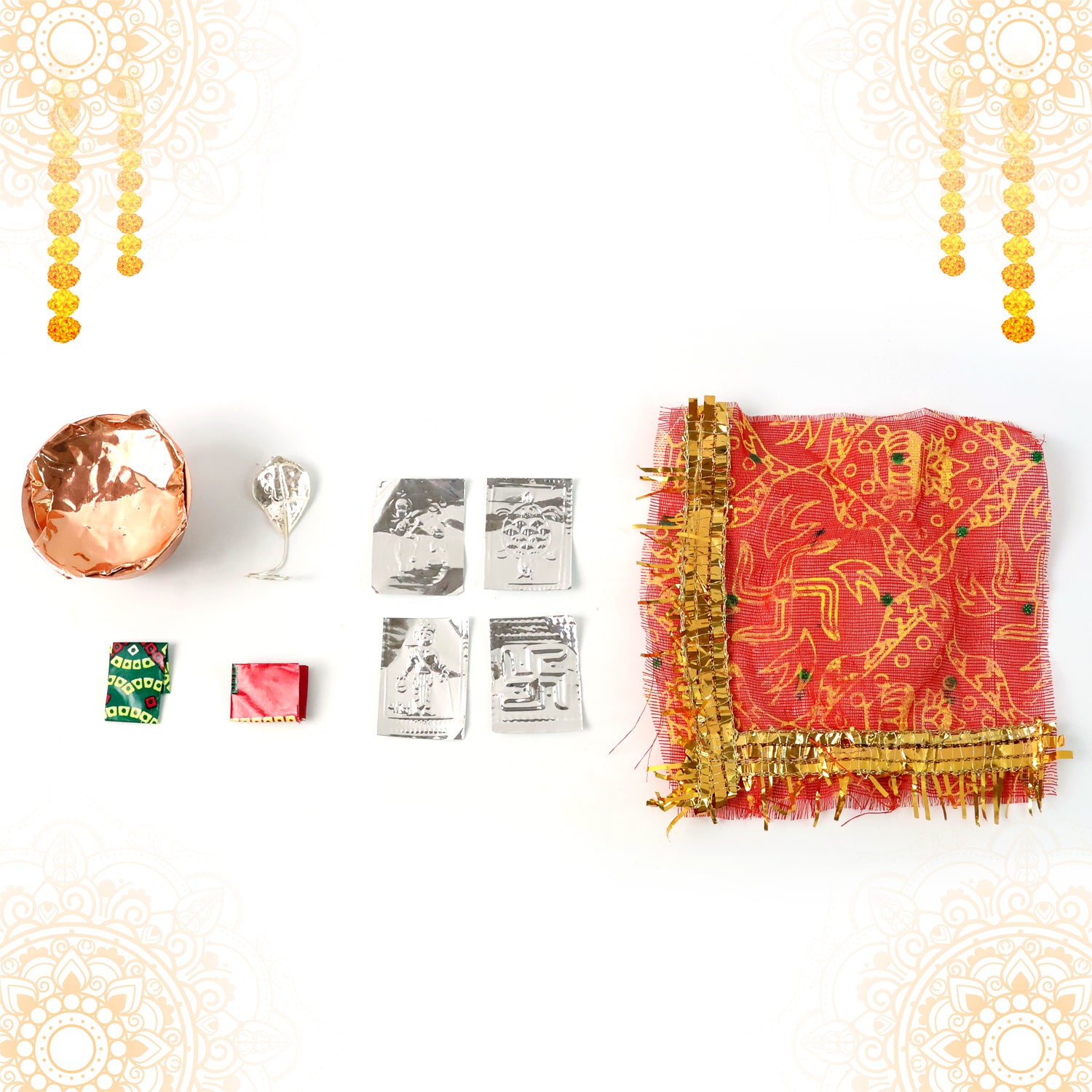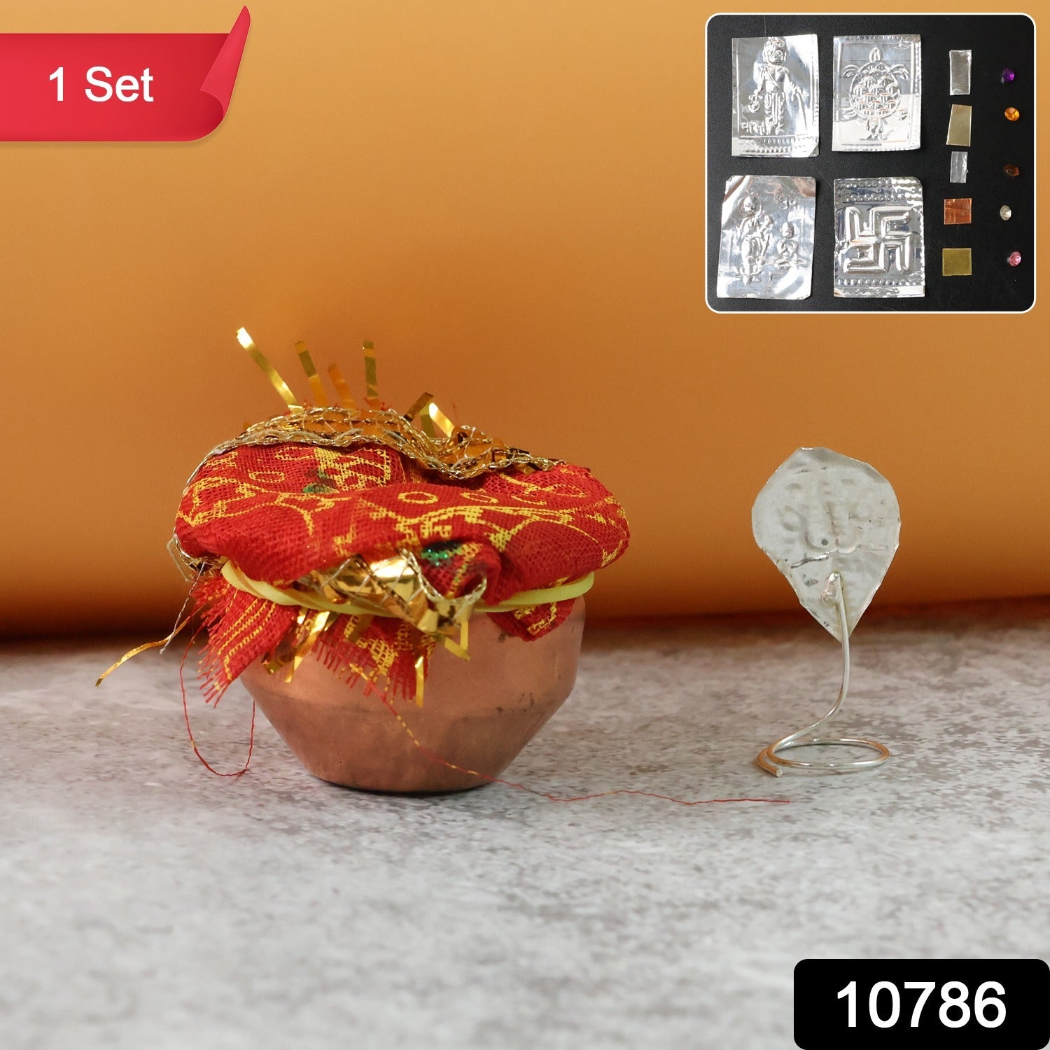 • Contents: Decorated mini kalash with cloth cover & lace, foil deity/yantra tokens, small navratna-style pieces (as shown)